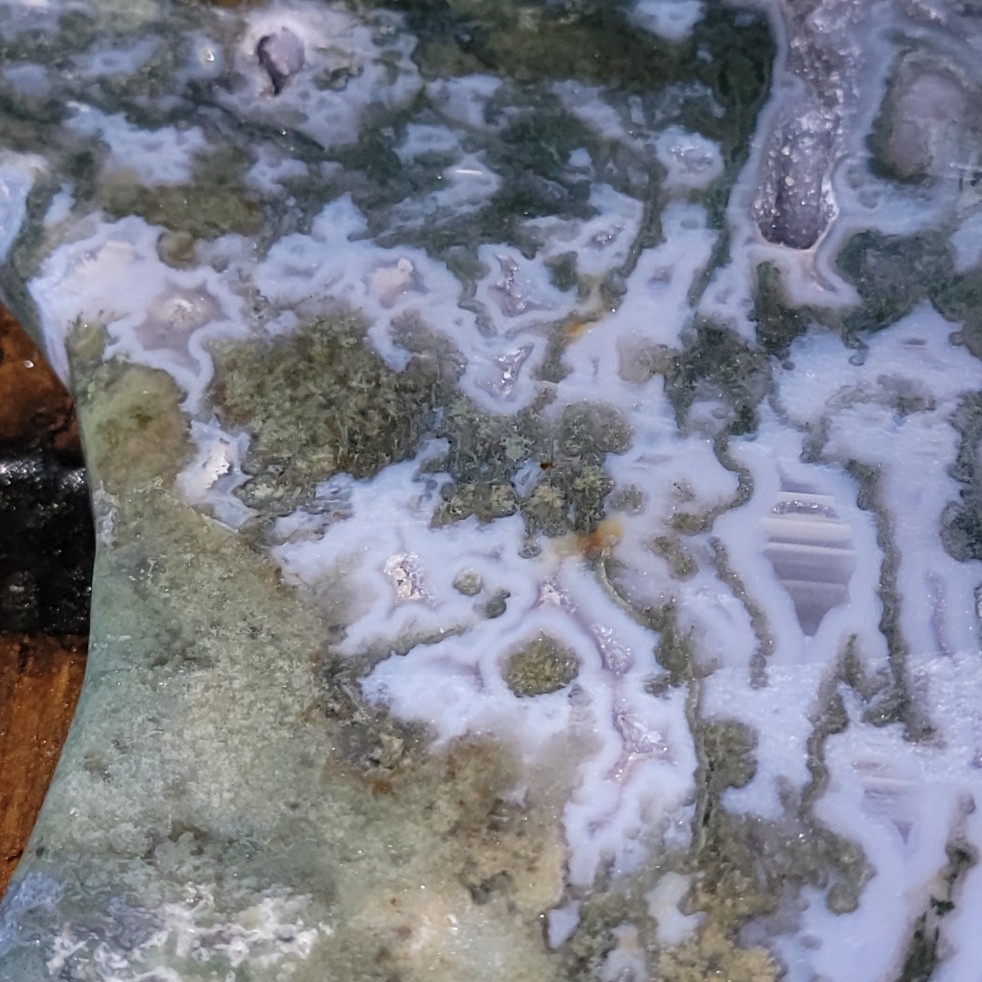 This XL Moss Agate Moon showcases the mesmerizing beauty of Moss Agate with intricate swirls and banding. The deep Amethyst Druze pockets on both sides add a touch of magic, making this piece truly stunning. Imagine embracing your inner forest nymph, dancing in the moonlight, captivated by the enchanting allure of this exquisite gemstone creation.