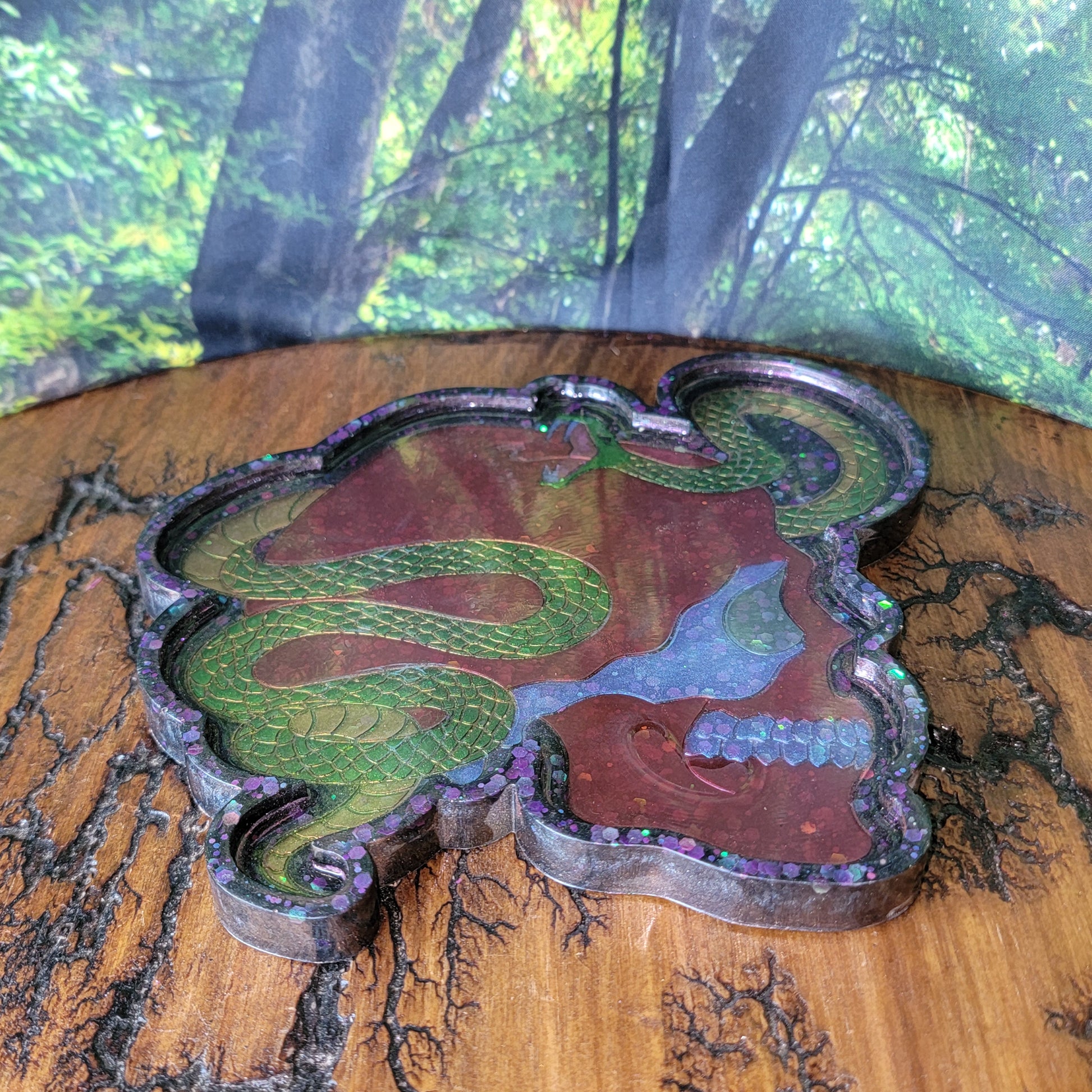 This tray does have a slight imperfection—a small section of the resin near the mouth that didn’t cover as intended—it still exudes charm and mystique. As a result, we're offering this at a discounted price, allowing you to enjoy this one-of-a-kind piece at a fraction of the cost!